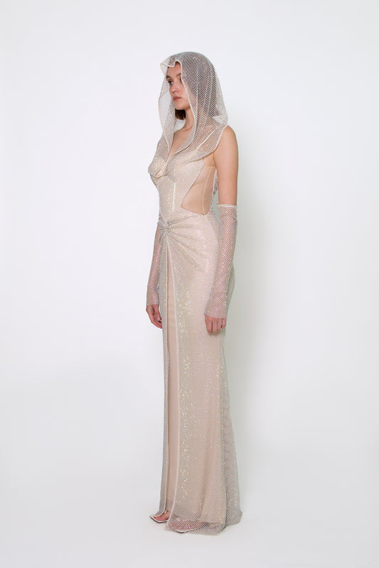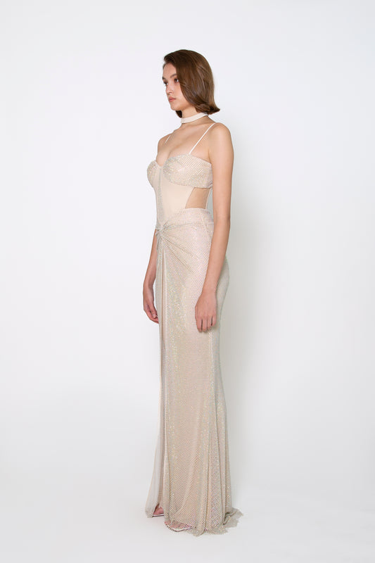 CUTOUT WAIST LONG SLEEVE CRYSTAL GOWN