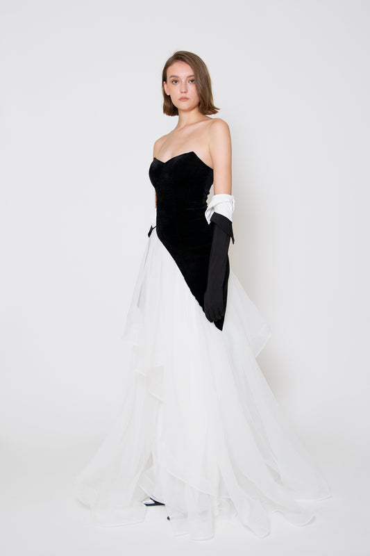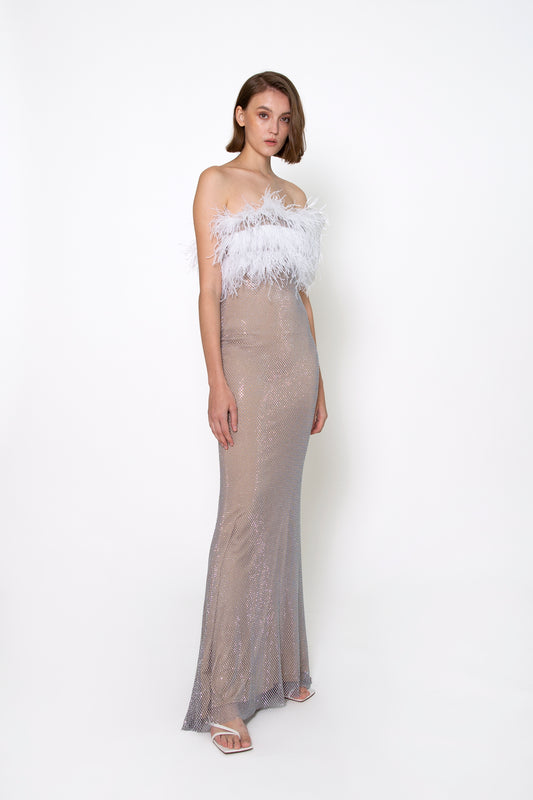 FEATHER TOP STRAPLESS CRSYTAL GOWN