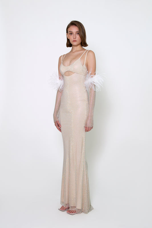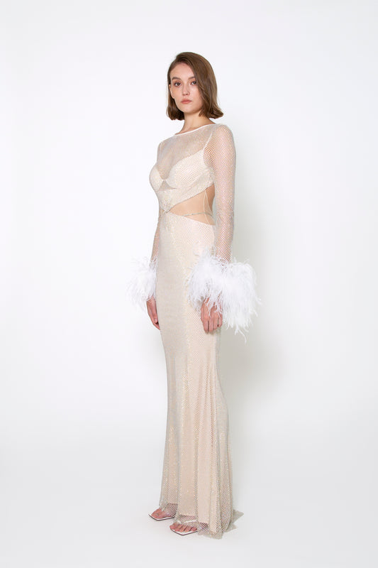 FEATHER-TRIMMED LONG SLEEVE CRYSTAL GOWN