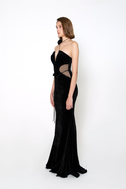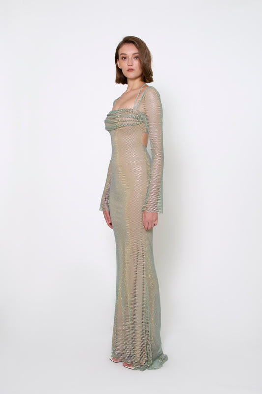 CUTOUT WAIST LONG SLEEVE CRYSTAL GOWN